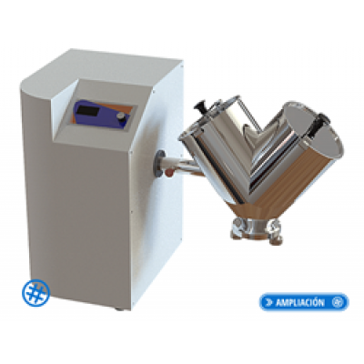 cubetas. Ideal para limpieza de cubetas y cambio de modelos. Mezclador en V para materiales sólidos y en polvo con cubetas intercambiables de 2, 4 y 8 litros, especialmente diseñado para realizar experimentos de mezclado en plantas piloto y laboratorios. Permite una mezcla eficaz de polvos secos, protege la calidad y garantiza la estabilidad del producto.