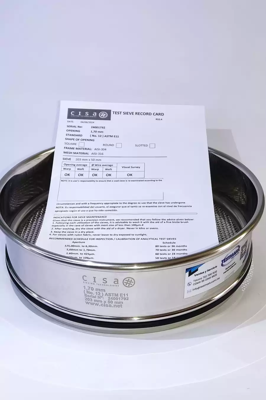 individual de cada tamiz grabada con láser, para asegurar